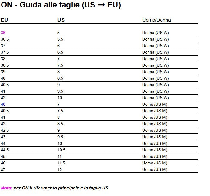 📏 Guida alle taglie On Running